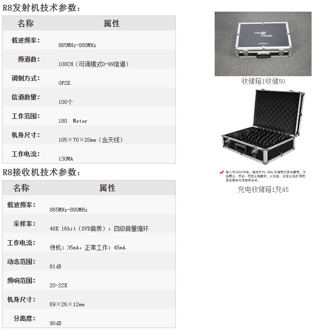視頻展示 耳掛式團隊無線講解系統 R8,適用政府、企事業單位、社會團體的檢查參觀接待講解等;該無線耳麥分發射機Transmitter和接收機Receiver;主要用法為:主講人使用發射機佩戴麥克風說話,參觀人員佩戴耳掛接收機收聽。R8導覽系統優勢:1.采用全世界各國通用的合法頻率;2.采用GFSK(高斯頻移鍵控)調制方式,